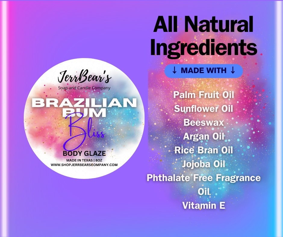 Presentamos nuestro lujoso Brazilian Bum Bliss. Este baño corporal, elaborado con ingredientes totalmente naturales como aceite de palma, cera de abejas y aceite de vitamina E, dejará tu piel suave y nutrida. Elaborado artesanalmente en Texas, este producto viral incluye una mezcla de aceites aromáticos como el de argán y el de jojoba para una experiencia placentera.